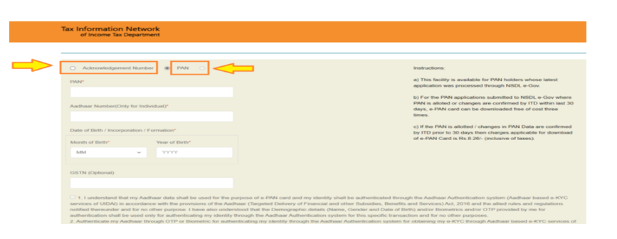 - जैसे ही होम पेज ओपन होगा आपको दो आप्शन Acknowledgement Number और PAN नंबर मिलेंगे, इनमें आपको किसी एक को सेलेक्ट करना होगा |