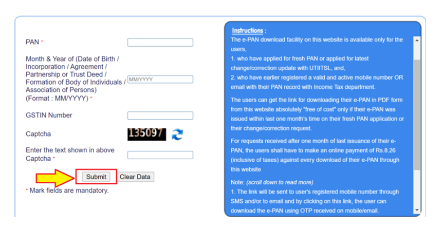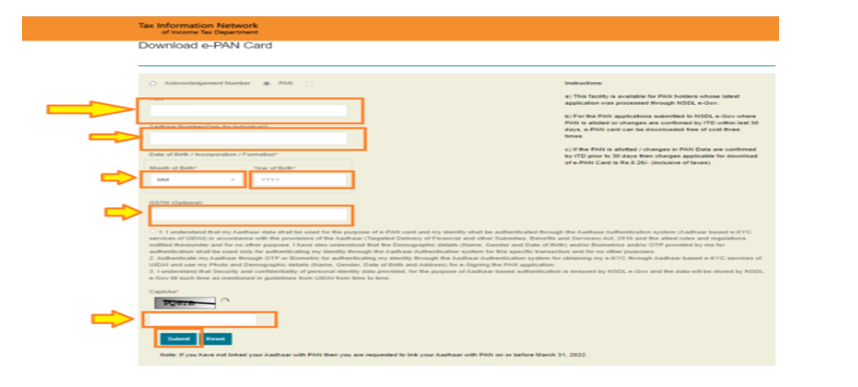 - अब एक नया पेज ओपन होगा, जिसमें आपको पैन नंबर, डेट ऑफ़ बर्थ आदि दर्ज करनें के पश्चात कैप्चा कोड भरकर submit पर क्लिक करे |