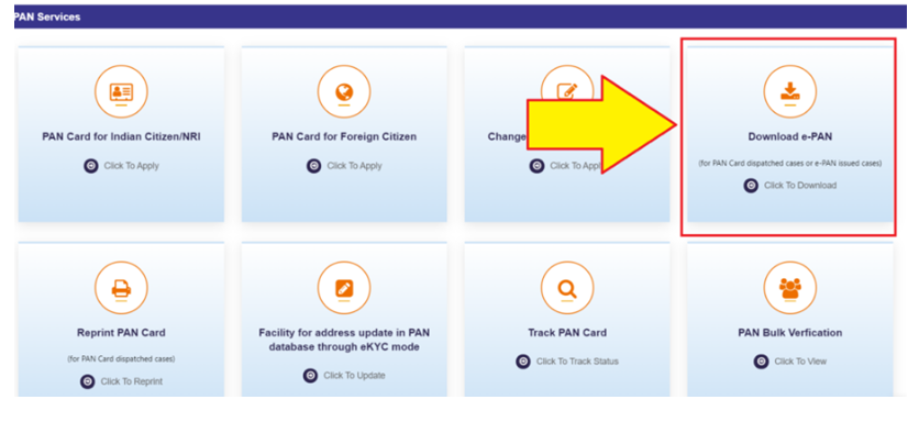 - आपके सामने एक नया पेज ओपन होगा, यहाँ आपको कई आप्शन मिलेंगे जिसमें से Download e-PAN के आप्शन पर क्लिक करे |