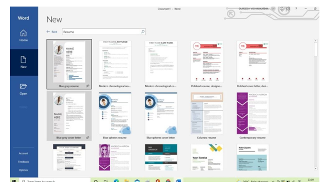 - New पर क्लिक करते ही एक सर्च बॉक्स ओपन होगा, यहाँ आपको Resume लिखकर सर्च करना होगा | अब आपके सामनें अनेक प्रकार के टेम्पलेट शो होंगे, इसमें से आप टेम्पलेट को सेलेक्ट करना होगा, इसके पश्चात आप इस पर डबल क्लिक करें। अब आपका रिज्यूम Word में Text Area में एडिट के लिए ओपन हो जाएगा।