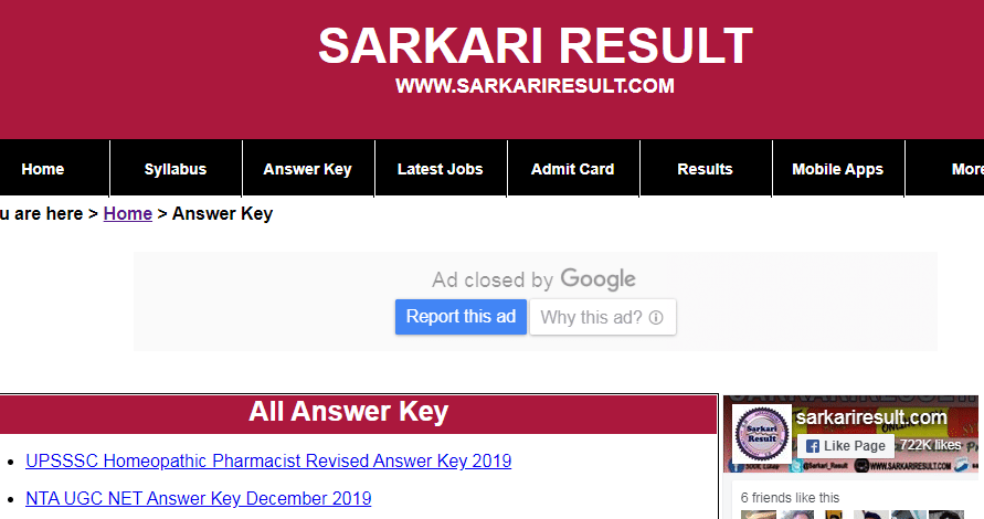 सरकारी रिजल्ट की वेबसाइट पर आपको सरकारी नौकरी की परीक्षा, या किसी एजुकेशनल एंट्रेंस एग्जाम से संबंधित किसी भी परीक्षा की ‘आंसर की’ यहां पर उपलब्ध होती है | किसी भी आंसर की, की जानकारी पाने के लिए आपको Answer Key ऑप्शन पर जाना होगा, जहाँ पर आपके जरूरत से सम्बन्धित Answer Key डाउनलोड करे |