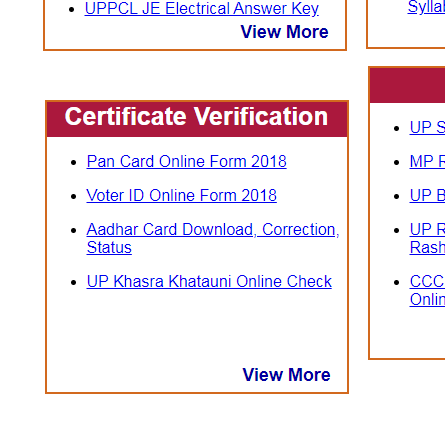 Sarkariresult.com पर सर्टिफिकेट वेरिफिकेशन का ऑप्शन दिया होता है, जिसमें आप पैन कार्ड, आधार कार्ड, निवास, आय, जाति आदि सर्टिफिकेट के लिए आवेदन कर सकते है या फिर इसके लिए यहां से वेरिफिकेशन कर सकते है | इसके अलावा खसरा, खतौनी से संबंधित जानकारी भी Certificate Verification ऑप्शन पर उपलब्ध होती है | यहां पर इस तरह की जानकारी आसानी से प्राप्त कर सकते है |