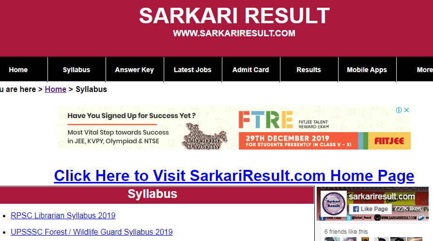 सरकारी रिजल्ट वेबसाइट पर आपको किसी भी छोटे से बड़े एंट्रेंस एग्जाम से संबंधित और नौकरी से संबंधित सिलेबस की जानकारी उपलब्ध कराई जाती है | आप अपने एग्जाम या नौकरी संबंधी सिलेबस डाउनलोड करने के लिए आपको सरकारी रिजल्ट पर Syllabus ऑप्शन पर क्लिक करना होगा, जिसके बाद ही डाउनलोड कर पाएंगे |