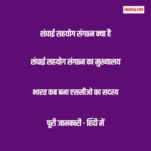 यहाँ आपको शंघाई सहयोग संगठन के विषय में जानकारी उपलब्ध कराई है | यदि इस जानकारी से संतुष्ट है, या फिर इससे समबन्धित अन्य जानकारी प्राप्त करना चाहते है तो कमेंट करके अपना सुझाव दे सकते है, आपकी प्रतिक्रिया का जल्द ही उत्तर दिया जायेगा | अधिक जानकारी के लिए hindiraj.com पोर्टल पर विजिट करते रहे |