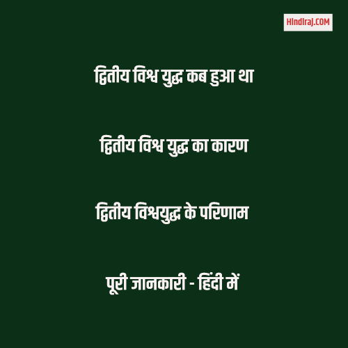 यहाँ आपको द्वितीय विश्व युद्ध (Second World War) के बारे में पूरी जानकारी उपलब्ध कराई गई है | यदि आपको इससे सम्बंधित अन्य जानकारी प्राप्त करनी है तो आप अपने विचार या सुझाव कमेंट बॉक्स के माध्यम से पूंछ सकते है | इसके साथ ही आप अन्य जानकारी प्राप्त करना चाहते है तो www.hindiraj.com पर विजिट करे |