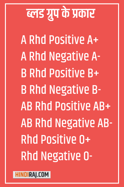 मनुष्य में शरीर में 4 तरह के ब्लड ग्रुप पाए जाते हैं | यह रक्त समूह आपके अपने माता-पिता से प्राप्त जीन पर आधारित होता है | इसमें से प्रत्येक समूह या तो Rhd+ (positive) या Rhd- (Negative ) होता है, जिस हिसाब से कुल आठ रक्त समूह बनते है | जो कि इस प्रकार है :-