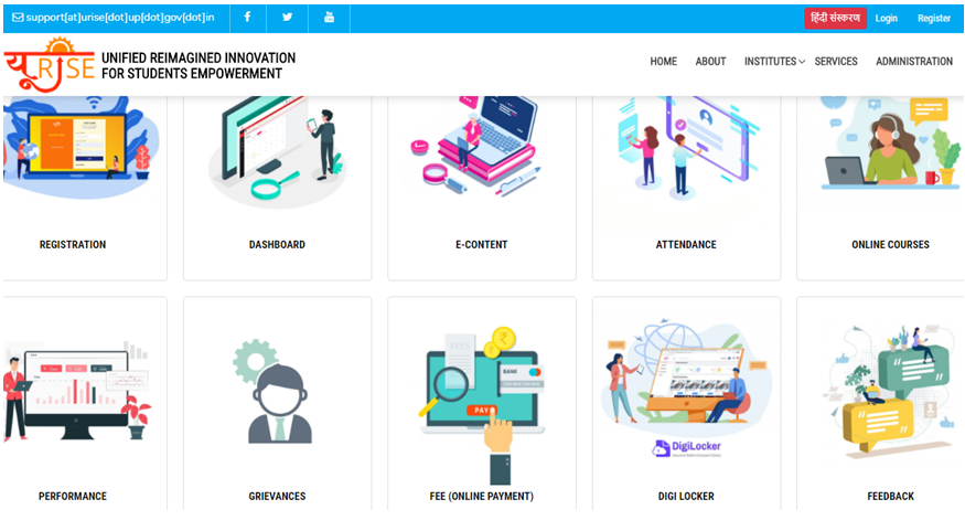 - आपके लिए इस पोर्टल पर, REGISTRATION, DASHBOARD, E-CONTENT, ATTENDANCE, ONLINE COURSES, PERFORMANCE, GRIEVANCES, FEE (ONLINE PAYMENT), DIGI LOCKER विकल्प दिए गए है जिनका चयन करके आप लाभ प्राप्त कर सकते है |
