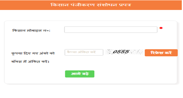 - रजिस्ट्रेशन के दौरान दिए गये मोबाइल नंबर और कैप्चा कोड टाइप कर आगे बढ़े और अपने किसान पंजीकरण फार्म में संशोधन करें |