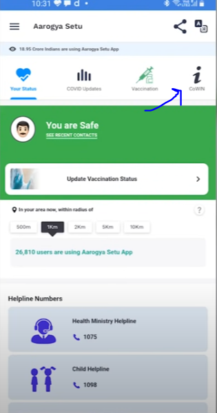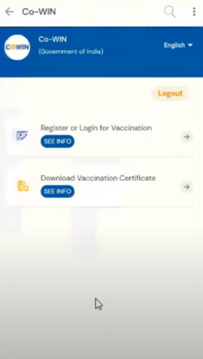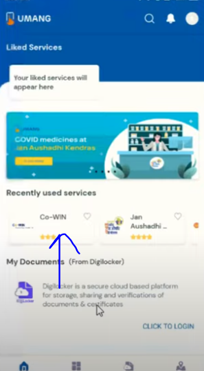- अब एप्प में लॉग इन करने के बाद कोविन टैब पर क्लिक करे |
