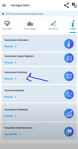 - अब दिए गए मेनू में से कोरोना वैक्सीन सर्टिफिकेट का आप्शन चुने |