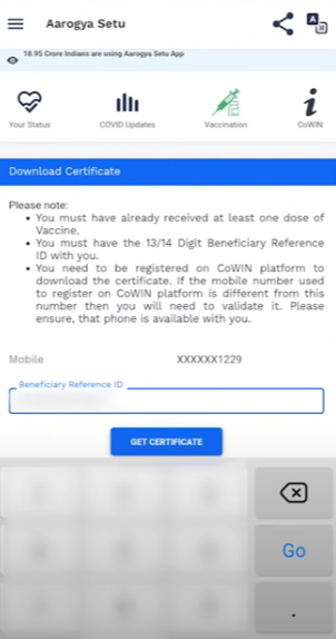- इसके बाद आपको मोबाइल स्क्रीन पर 2 आप्शन दिखाई देगे, जिसमे आपको ‘डाउनलोड वैक्सीनेशन सर्टिफिकेट’ आप्शन पर क्लिक करना है |