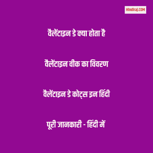 यहाँ आपको वेलेंटाइन डे के विषय में जानकारी उपलब्ध करायी गई है | अब आशा है आपको जानकारी पसंद आयी होगी | यदि आप इससे संतुष्ट है, या फिर अन्य कोई जानकारी प्राप्त करना चाहते है तो कमेंट करके पूंछ सकते है, और अपना सुझाव प्रकट कर सकते है | अधिक जानकारी के लिए hindiraj.com पोर्टल पर विजिट करते रहे |