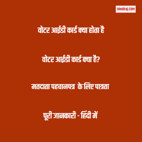 वोटर आईडी कार्ड (Voter ID Card) को हिंदी में ‘मतदाता परिचय पत्र’ या फिर निर्वाचन कार्ड कहते है, इसके अतिरिक्त इसे एलेक्टोर्स आइडेंटिटी कार्ड (इपिक) भी कहा है | जो भारतीय नागरिक मतदान करने के योग्य हो जाते है उन्हे यह फोटो पहचान पत्र भारत के चुनाव आयोग द्वारा जारी किया जाता हैं | वोटर आईडी कार्ड भारत के वयस्क नागरिक होने का एक प्रमाण होता है | देश के लिए सरकार को चुनने में आप योगदान होता है, भारत के प्रत्येक नागरिक के लिए मतदाता परिचय पत्र होना आवश्यक है अधिकतर सरकारी कामो में या फिर अन्य किसी कामों में मतदाता परिचय पत्र एक आईडी प्रूफ के रूप में दे सकते है |