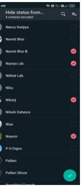 - इसके बाद आपकी स्क्रीन पर एक नए पेज पर कॉन्टेक्ट की लिस्ट प्रदर्शित हो जाएगी। जिसमे से आपको उनके नाम के सामने क्लिक कर देना होगा। जिनको आप अपना स्टेटस दिखाना नहीं चाहते हैं।